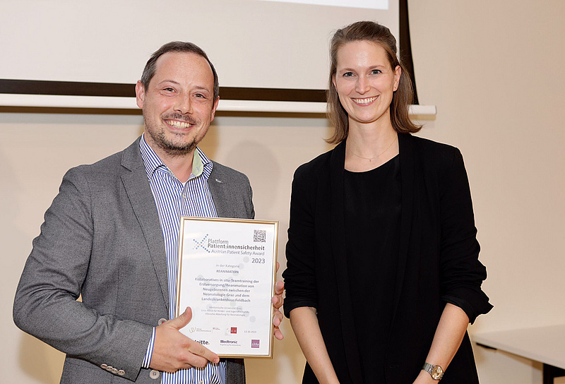 Im heurigen Jahr konnte Lukas Mileder, Facharzt für Kinder- und Jugendheilkunde an der Klinischen Abteilung für Neonatologie der Med Uni Graz, den Award in der Kategorie Reanimation für sein Projekt "Kollaboratives in situ-Teamtraining der Erstversorgung/Reanimation von Neugeborenen zwischen der Neonatologie Graz und dem Landeskrankenhaus Feldbach" gewinnen. Mitte Oktober wurden im Rahmen einer Tagung der Plattform Patient:innensicherheit die Awards in den Kategorien Rettungsdienst, Reanimation, Ausbildung und Klinisches Risikomanagement, sowie 2 weitere Anerkennungspreise vergeben. Mit den Anerkennungspreisen soll Awareness für zukunftsträchtige und nachhaltige Themen geschaffen werden.