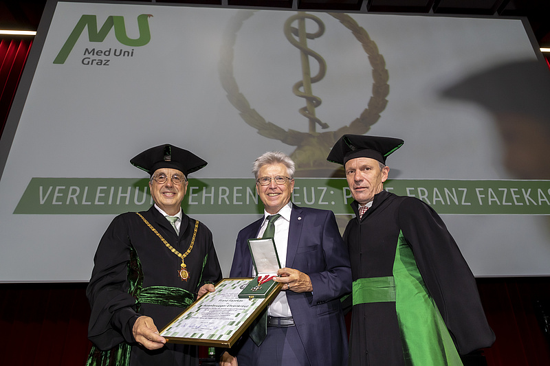 Gleich zwei verdiente Persönlichkeiten wurden kürzlich im Rahmen eines akademischen Festaktes an der Medizinischen Universität Graz für ihr großes Engagement rund um Wissenschaft und Forschung ausgezeichnet. Franz Fazekas erhielt mit dem Auenbrugger Ehrenkreuz die höchste Auszeichnung der Med Uni Graz verliehen. Peter Holzer wurde mit dem Ehrenring der Universität ausgezeichnet. Der Ehrenring wurde heute zum ersten Mal überhaupt verliehen.