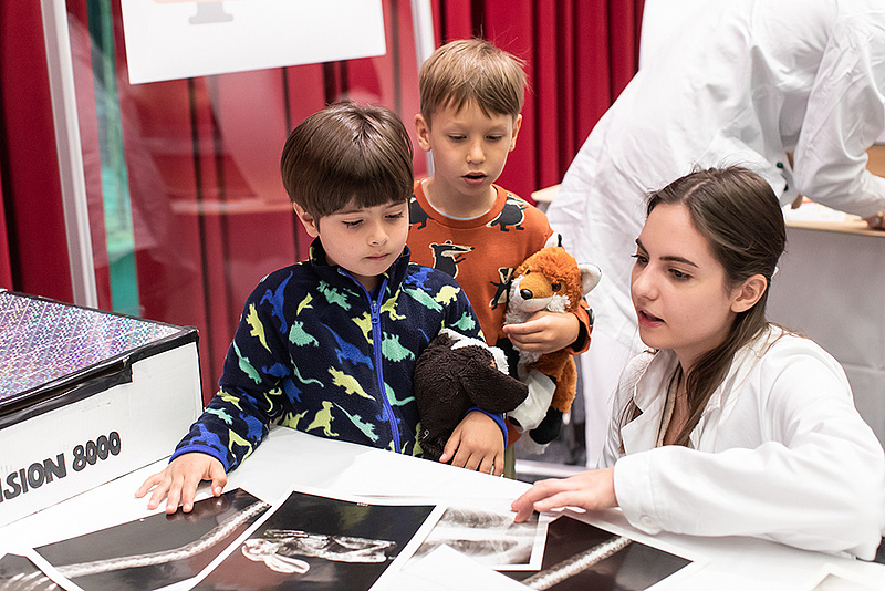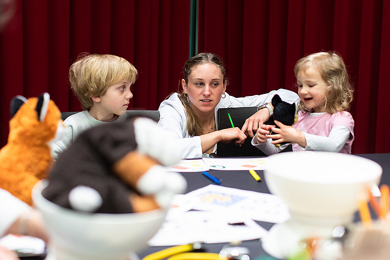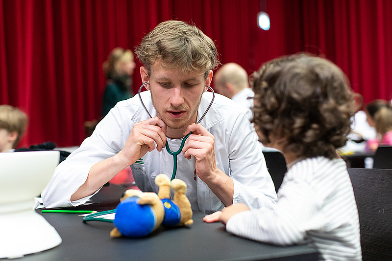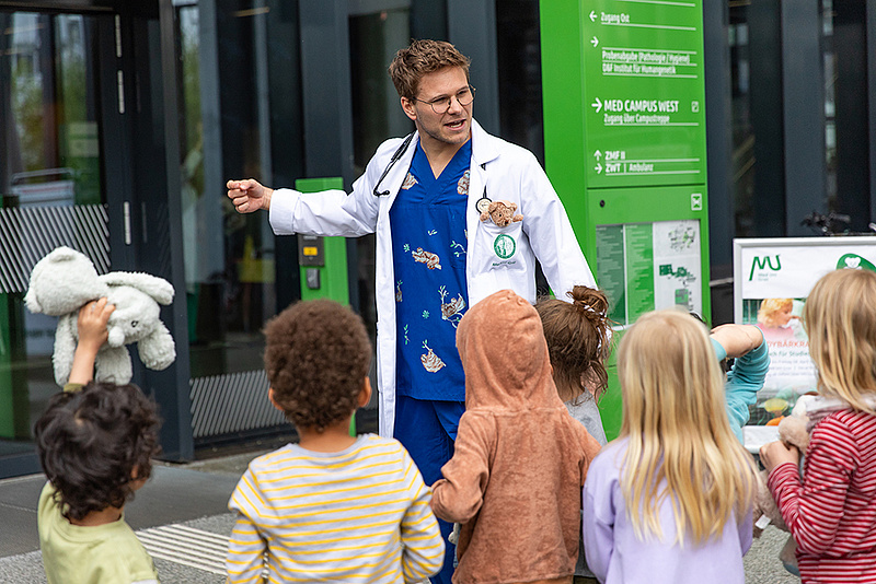 Vom Anamnesegespräch über die Untersuchung bis hin zum Besuch in der Apotheke – beim Teddybär-Krankenhaus an der Med Uni Graz wird ein typischer Arzt- bzw. Krankenhausbesuch auf kindgerechte Art und Weise simuliert. Kinder im Alter von drei bis sechs Jahren waren im April wieder herzlich eingeladen, mit ihrem Lieblingsstofftier an die Med Uni Graz zu kommen - und dieses Angebot wurde wieder von vielen Kindern angenommen! Die Teddy-Docs – Studierende an der Med Uni Graz – warteten auf die flauschigen Patient*innen, jedes Kind wurde von einem Teddy-Doc betreut. Auf die Aufnahme folgten das Anamnesegespräch, die Diagnose sowie die Behandlung. Den Abschluss bildete ein Besuch in der Teddybären-Apotheke, wo die jungen Begleiter*innen die richtige „Medizin“ für den kleinen Kuschelfreund abholen konnten.