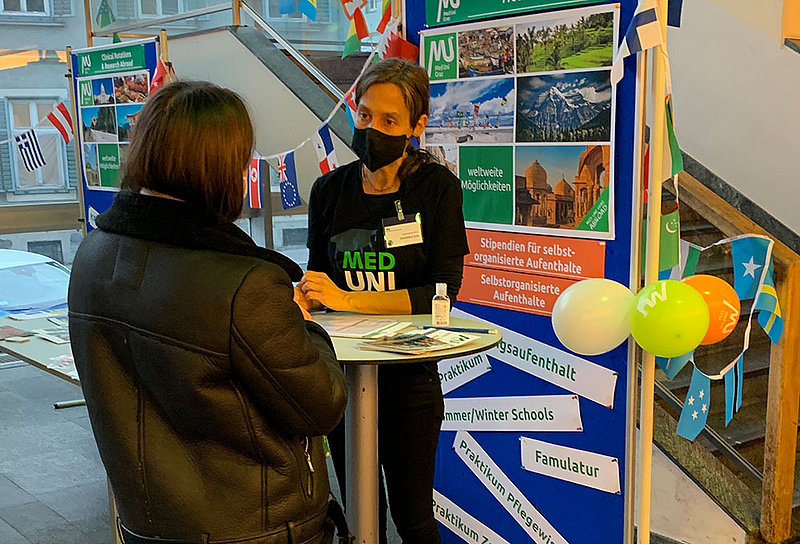 Das International Office lud Studierende und Graduierte am 14. Oktober 2021 in die Vorklinik ein, um sie über die zahlreichen Möglichkeiten eines studienbezogenen Auslandsaufenthalts zu informieren. Nach einer Online-Version im Vorjahr konnte die Veranstaltung dieses Jahr zur Freude aller Beteiligten wieder vor Ort stattfinden und stieß mit rund 70 Besucher*innen auf reges Interesse. Die einzelnen Mobilitätsprogramme der Med Uni Graz wurden in einer Kurzpräsentation vorgestellt, zusätzlich informierte und beriet das Team des International Office Interessierte bei Info-Ständen und beantwortete sämtliche Fragen zu Zielländern, Partnerinstitutionen, Fördermöglichkeiten, Bewerbungsverfahren, bestmögliche Integration ins Studium und vieles mehr.