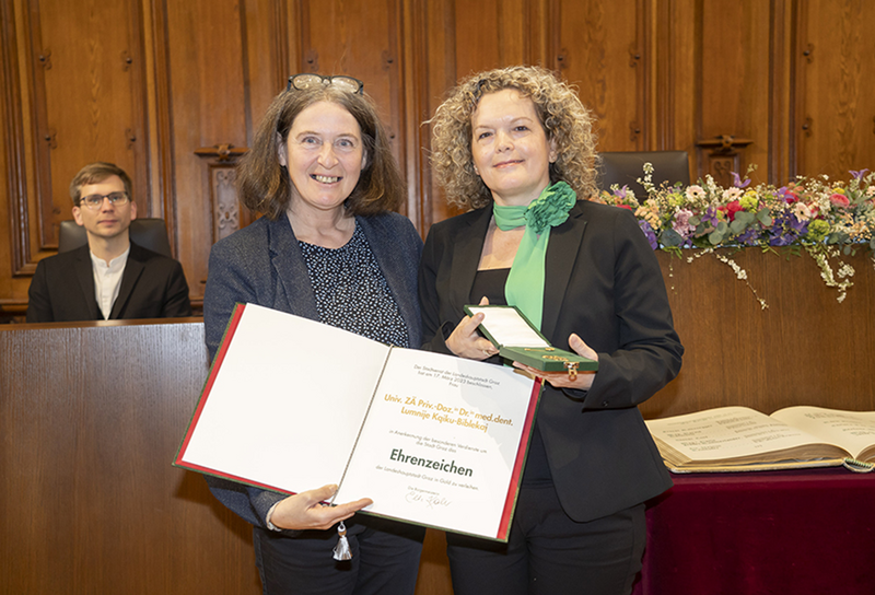 Eine der Ausgezeichneten im wissenschaftlichen Bereich ist Lumnije Kqiku-Biblekaj von der Klinischen Abteilung für Zahnerhaltung, Parodontologie und Zahnersatzkunde der Med Uni Graz. Die in Prishtina geborene Zahnmedizinerin war als Gastärztin an der Universitätsklinik für Zahn-, Mund- und Kieferheilkunde der Med Uni Graz tätig, wo ihre Promotion nostrifiziert wurde. Nach Forschungsaufenthalten u. a. in Zagreb und Tübingen habilitierte sie sich an der Medizinischen Universität Graz, wo sie seit letztem Jahr die Spezialambulanz "Endodontie und Zahntraumatologie" leitet und auch als Lehrbeauftragte und (Co-)Autorin tätig ist. Lumnije Kqiku-Biblekaj erhielt den wissenschaftlichen Förderungspreis der ÖGZMK (Österreichische Gesellschaft für Zahn-, Mund-und Kieferheilkunde) Steiermark und wurde zudem im Rahmen des „Second Clinical Congress of the Kosovo College of Surgeons" mit dem Preis "Leadership by Example" ausgezeichnet.