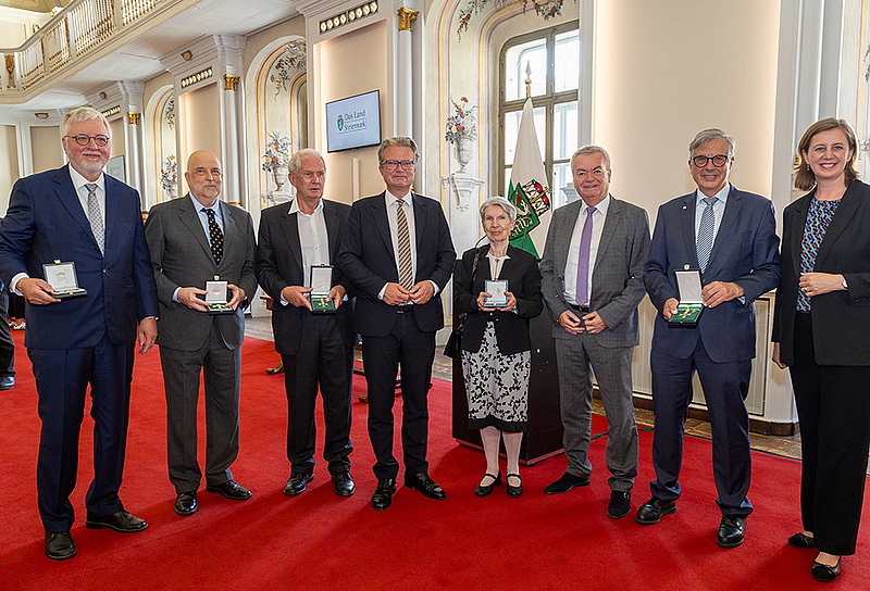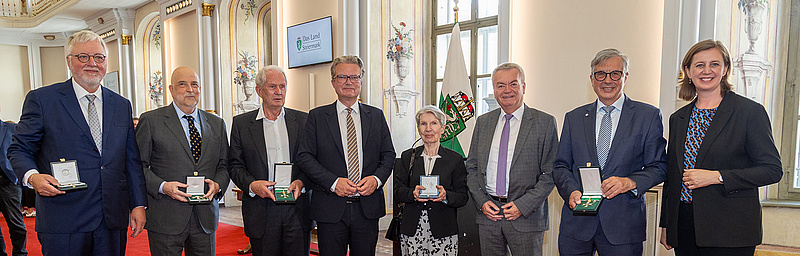 In der Aula der Alten Universität überreichte Landeshauptmann Christopher Drexler gemeinsam mit Landeshauptmann-Stellvertreter Anton Lang am 06. Juni 2024 an verdiente Persönlichkeiten Große Goldene Ehrenzeichen des Landes Steiermark sowie Ehrenzeichen des Landes Steiermark für Wissenschaft, Forschung und Kunst I Klasse. Neben den Ausgezeichneten und ihren Familienangehörigen, Freunden und Wegbegleitern begrüßte LH Drexler unter anderem Landesrätin Barbara Eibinger-Miedl, Klubobfrau Sandra Krautwaschl, den ehemaligen LH-Stv. Michael Schickhofer, Sektionschef Elmar Pichl (BMBWF) und TU-Rektor Horst Bischof beim Festakt.