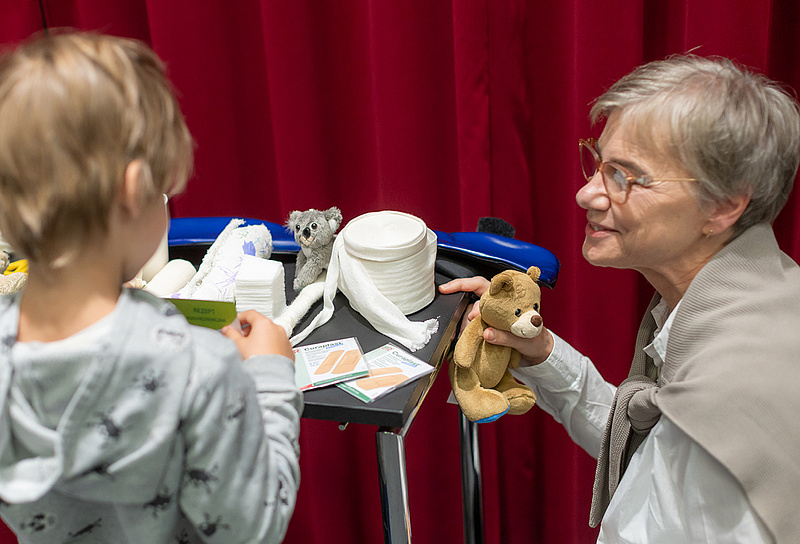 Die beliebte Kuscheltierklinik an der Med Uni Graz hat ihre Pforten geöffnet. Zahlreiche Kinder im Alter von drei bis sechs Jahren sind bereits mit ihren plüschigen Patient*innen eingetroffen, um sie gemeinsam mit Studierenden der Medizin, Pharmazie, Zahnmedizin und Pflegewissenschaften „verarzten“ zu lassen. Vom ersten Anamnesegespräch über die Diagnose bis hin zur Behandlung und dem Besuch in der Apotheke – das Programm ist in vollem Gange.