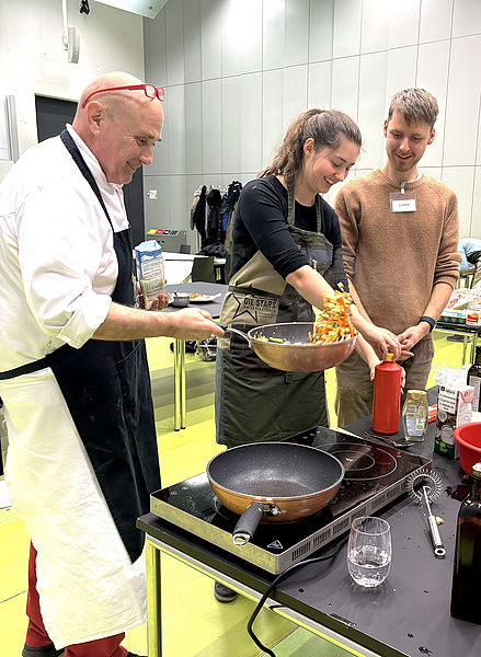 Kürzlich fand an der Medizinischen Universität Graz erstmals die Campus Cooking Night mit Studierenden statt. Initiiert und begleitet durch das Team des Vizerektors für Studium und Lehre sowie umgesetzt gemeinsam mit Sonja Lackner und Koch Attila Varnagy, stand der Abend ganz im Zeichen der NutriMEDucation – Ernährung im Rahmen der medizinischen Ausbildung. In entspannter Atmosphäre kochten zehn Studierende gemeinsam kreative Gerichte, mit eher unbekannten oder geretteten Lebensmitteln. Beim gemeinsamen Verkosten wurden Rezepte, Zutaten und alltagstaugliche Tipps für eine gesunde, nachhaltige Küche mit den Expert*innen besprochen.