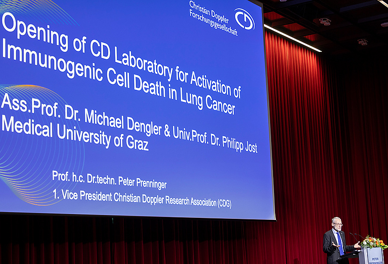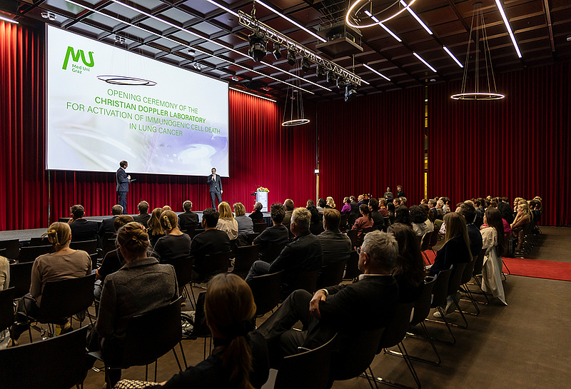 Die feierliche Eröffnung des neuen Christian-Doppler-Labors für Aktivierung des immunogenen Zelltods bei Lungenkrebs fand gestern in der Aula der Medizinischen Universität Graz statt. Zahlreiche Vertreter*innen aus Wissenschaft, Wirtschaft und Politik nahmen an der Veranstaltung teil und unterstrichen damit die hohe Relevanz des neuen Forschungslabors für die Weiterentwicklung innovativer Krebstherapien.
